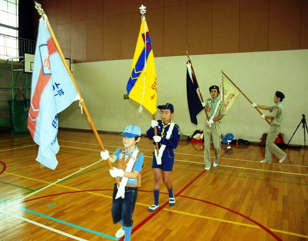 当日はこの任命式、入隊・上進式の後、育成会(保護者会というとわかりやすいかなあ)総会、そして各隊保護者説明会が行われ、台風直後の大雨の中、無事終了しました。