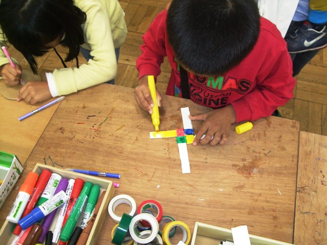 枝やどんぐり、松ぼっくり等を使ってどんなふうに作ろうかなーと子どもたちは夢中です。