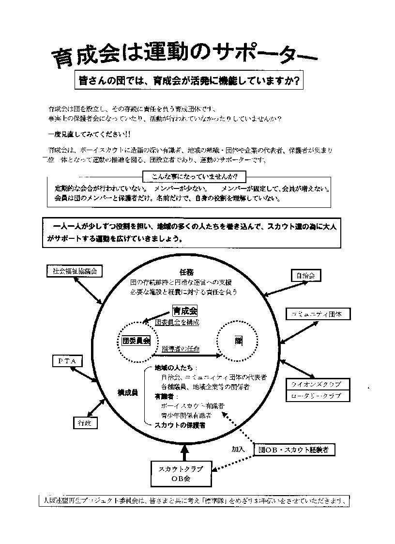 スカウト教育に当たっては、保護者をはじめ、教育、宗教、社会奉仕、体育、商工関係その他地域の関係者が育成団体となり、奉仕の精神をもって、スカウト教育活動を維持し発展させるため、育成会を設立する。