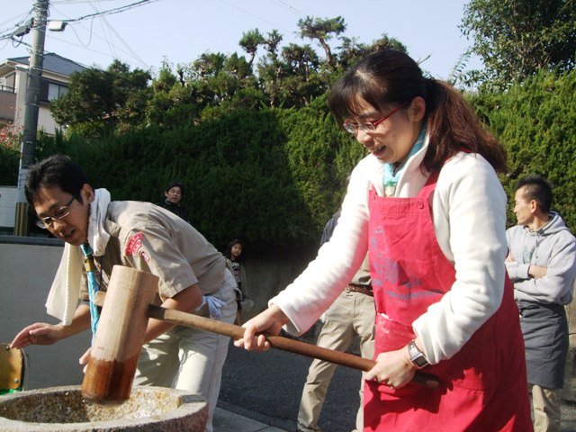 スカウトたちが劇や歌の出し物の時間になっても、残った団委員さんたちはひたすら40㎏を全部つきます。